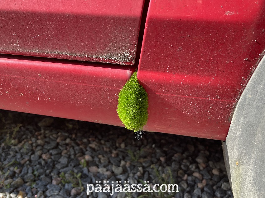 Tähän oli hyvä päättää syksyn tutkailu. Yhden asian vielä ehdin huomata. Nimittäin autooni on ilmestynyt sammalpallo oven väliin! Mistä ihmeestä semmoinenkin on siihen tupsahtanut? Hetken naureskeltuani, päätin, että autolla pitäisi varmaan ajella enemmän, jos se alkaa kasvaa jo sammalta. Noh, syksy on alkanut niin eiköhän tässä tule vielä johonkin lähdettyä ajelulle. Vaikkapa sienimetsään. Ken tietäisi.