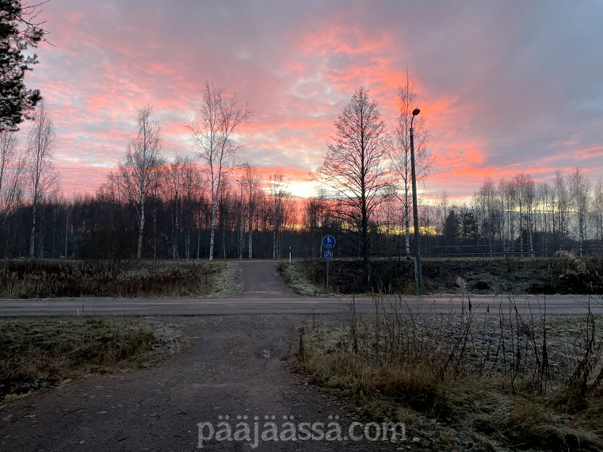 Päätin lähteä vielä autolla ajelemaan kohti auringonlaskua, koska tuohon aikaan on vaan niin älyttömän hienonnäköiset maisemat. Ajelin moottoritietä pitkin Mansikkalaan, ja juuri siinä kohtaa syttyivät valot pylväisiin. Sekin oli todella hienon näköistä. En tietenkään saanut otettua kuvia tästä tapahtumasta, koska minun piti ajaa autoa. Liikennekin oli kohtalaista tuohon aikaan (noin kello 16) ja tienpinta oli hähmäinen. Olikin aika jännää ajella pitkästä aikaa talvirenkailla kun tiesi, että tie on jäässä.