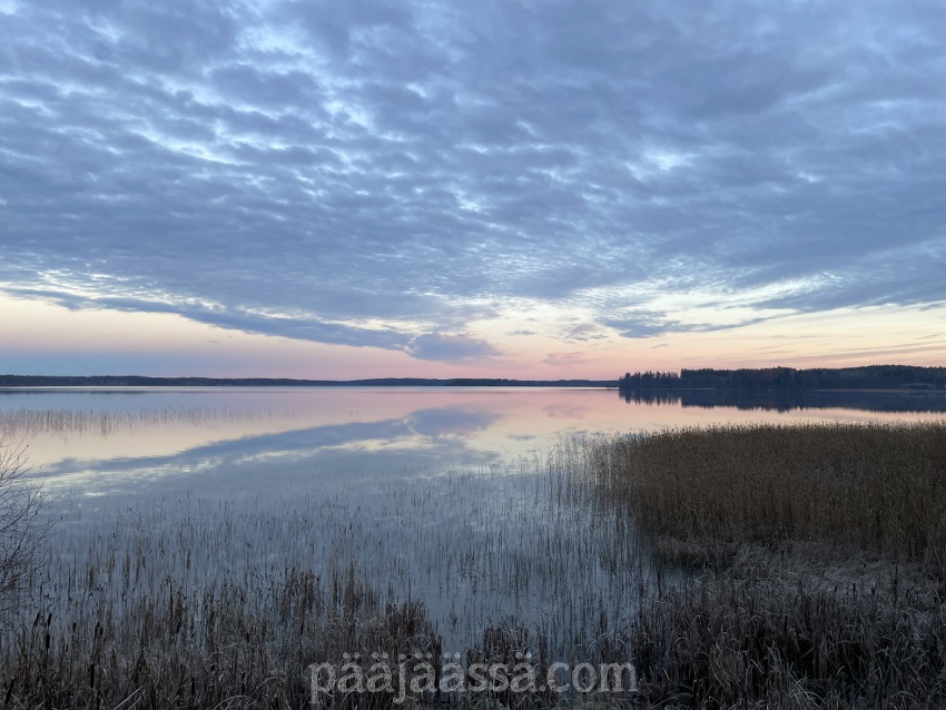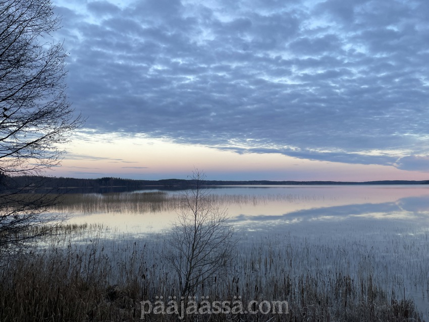 Ei kyllä näkymät pettäneet tälläkään kertaa! Nyt kun puissa ei ole lehtiä, niin kaikki lehtipuiden oksat näyttävät todella hienoilta. Sen lisäksi oli vielä pastellinvärinen taivas järven yllä. Aurinko laskee vastakkaiseen suuntaan, ja on todella uskomatonta kuinka se värjää idänpuoleisen taivaan. Kävelin ylös torniin patsastelemaan. Järvellä ei näkynyt ketään.