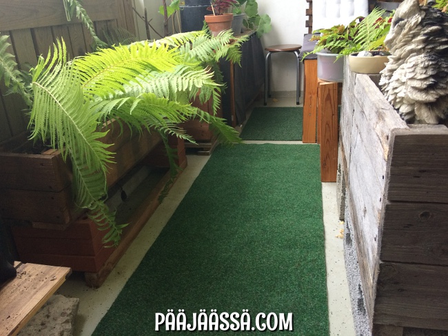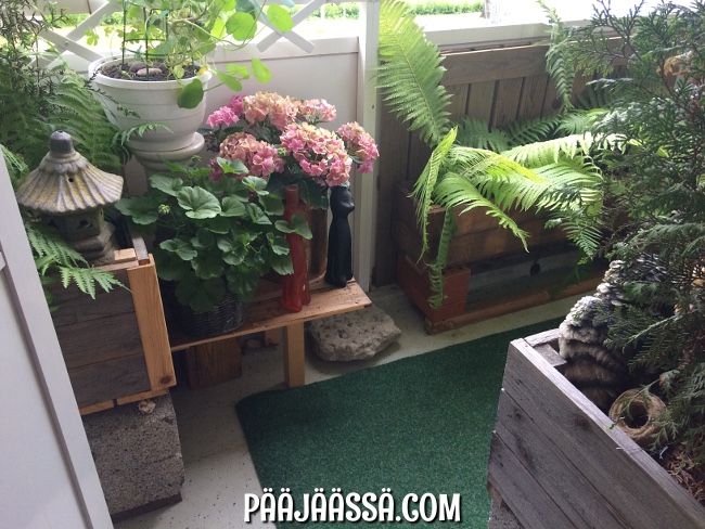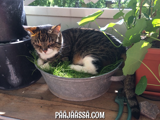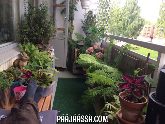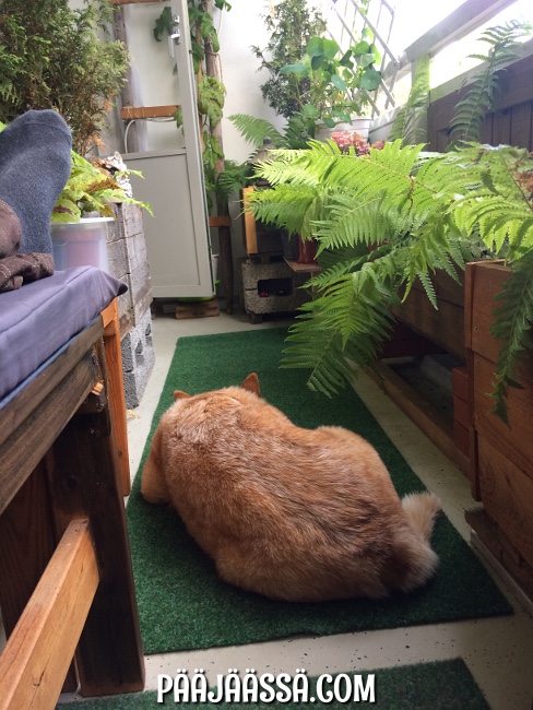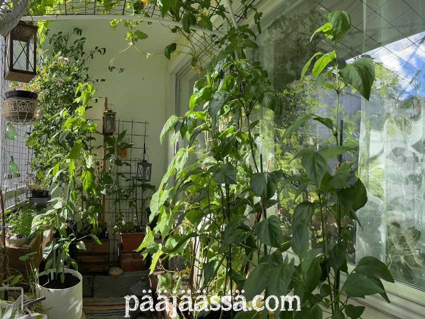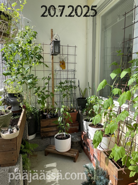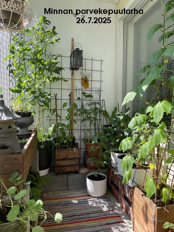 Parvekepuutarha on täydessä kasvussa. Sato on auttamatta myöhässä, sille nyt ei vaan voi mitään. Olkoon! Hauskaahan näitä rehuja on kasvatella, ihan sama tuleeko niistä mitään vai ei. Toki onnistumisenilojakin kaivataan. Kimalaisia pörrää vieläkin parvekkeella kurkkujen kimpussa, muuten on ollut aika hiljainen pölyttäjäporukan suhteen.