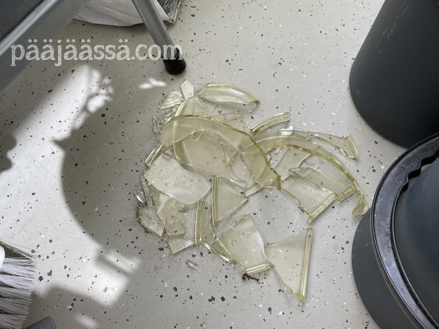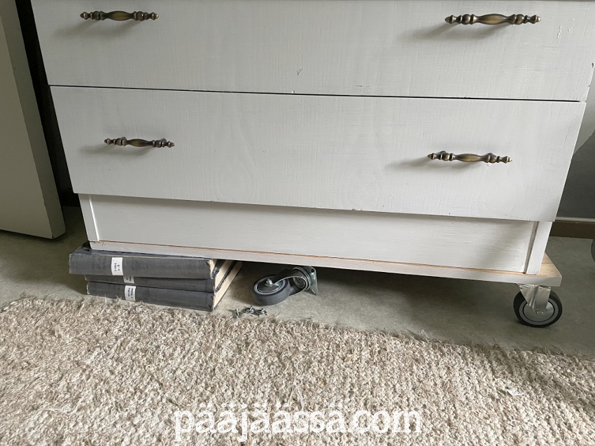 Vahinkojakin tässä meinasi tosin käydä. Seinustalla oli kaksi lipastoa alunperin päällekkäin (1. kuvassa). Olin ruuvaillut renkaat lipastopinon alle, ja yhdestä renkaasta irtosi kaikki ruuvit kun liikuttelin sitä. Onnistuin jotenkin ottamaan pinosta kiinni, ettei ylempi pömpeli tule varpaille. Täpärällä oli. Ylemmän lipaston sisällä oli lasitavaraa. Onneksi sain otettua pömpelistä kiinni ja tyhjennettyä sen, mutta kävihän se selkään aika lailla.