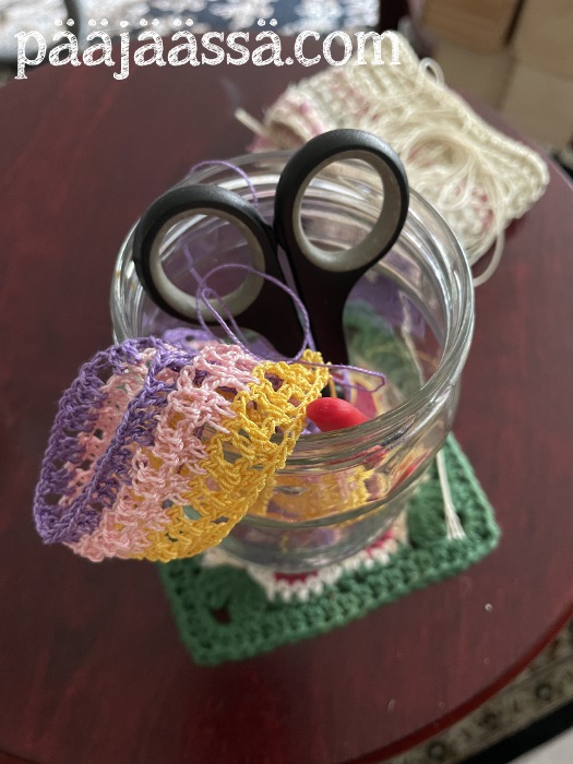Käsityöprojektit ovat kyllä vihoviimeisiä asioita, joita kannattaa alkaa tekemään jos on muutoin ajan kanssa tiukkaa. Niihin saa nimittäin kulumaan sellaistakin aikaa mitä ei oikeasti olisi tarve käyttää. Minulle iskee välillä se neuloosi, joka on niin paha, että koko muu maailma unohtuu (flow/hyperfocus). Se käy myös ikävästi käsiin ja hartioihin. Se tuntuu ja kuuluu myös vatsan kurnimisena, koska unohdan syödä ajallaan.
