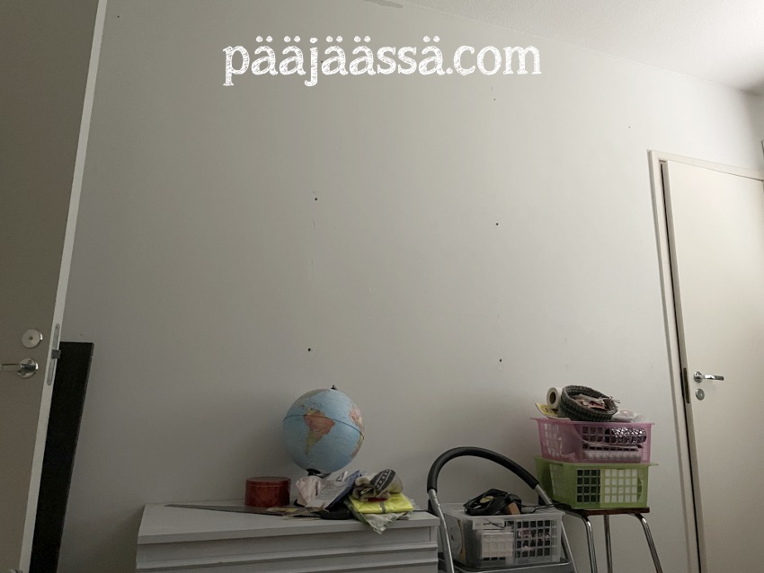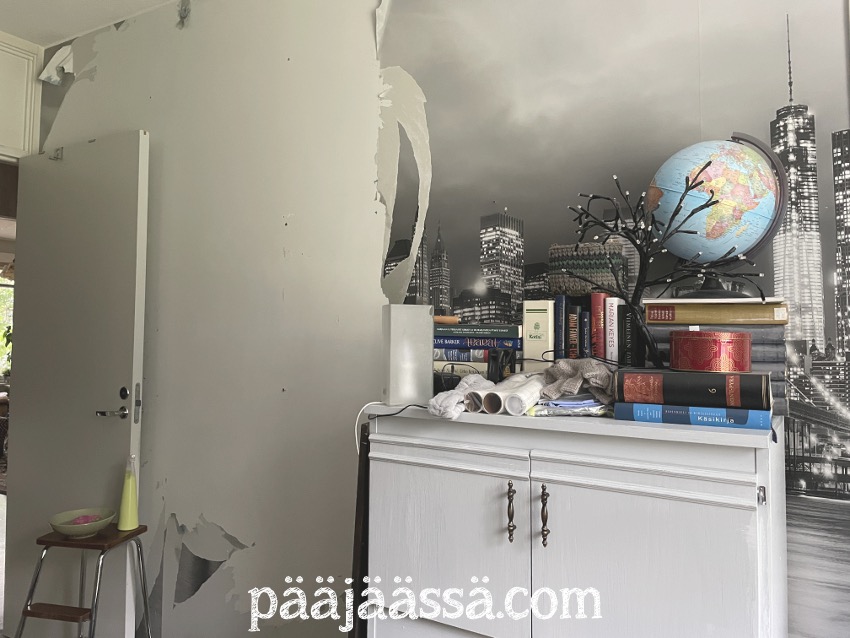 Olin miettinyt pitkään makuuhuoneen seinän kaupunkitapetin poistamista, ja kokeilinkin alkukesästä miten se olisi mahdollista. Valokuvatapetti oli kiinnitetty vesiliukoisella liisterillä, ja itse asiassa, tapetin poistaminen juuri siitä syystä olikin aika helppoa ja vaivatonta. Olisinpa tämänkin tajunnut aikaisemmin! Mutta, nyt se on poistettu eikä siihen mennyt aikaa kun parisen tuntia. Välineitäkään ei tarvinnut kuin sienen, jonka pystyi kastelemaan. Kun tapetin kasteli, se kostui sen verran läpi, että se irtosi seinästä helposti. Lopuksi pesin seinästä liimajäämät pois pesuaineella.