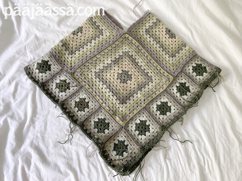 Saapihan niihin asioihin kulumaan paljon aikaa kun tekee saman asian monta kertaa. En tajua miten tästäkin tuli aivan eri kokoinen, mitä mallista katsoin. Tietysti, mallissa ei kerrottu minkä kokoisella koukulla se oli virkattu. Siinähän tämä oma versioni menikin pieleen, kun minulla oli pienempi koukku. Noh, ei muuta kun purin sötöksen, ja aloitin alusta uuden. Tällä kertaa aloitin tekemään ponchoa kaula-aukosta alaspäin. Halusin varmistaa, että pääni mahtuu siitä läpi. Mutta eihän siihen saa noita isoäidinneliöitä samalla tavalla tehtyä. Pitää keksiä jotain muuta.