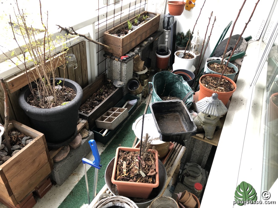 Siinäkin suhteessa parvekeprojektilla on ollut vähän nihkeä alku, koska kaikki asiat piti suunnitella niin tarkasti. Se vei aika paljon aikaa. Nyt homma on kuitenkin hoidossa, ja voin kaikessa rauhassa laitella tavaroita paikoilleen. Tomaateillekin oli keksittävä viritys, että niille saa asennettua jotenkin tukinarut, tai tukikepit. Siispä, mietiskelin aikani mitä tarvikkeita minulta löytyisi asian hoitamiseen. Olen useampana vuonna laittanut tomaateille harjanvarsista tukikepit. Ne ovat nykyään hieman huonorakenteisia, ja tuppaavat hajoamaan käytössä, kun ne joutuvat olemaan kosteassa mullassa. Siispä, naruviritys piti saada paikoilleen jotenkin muuten.