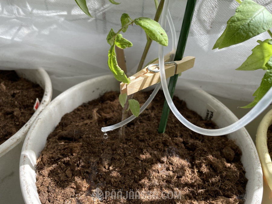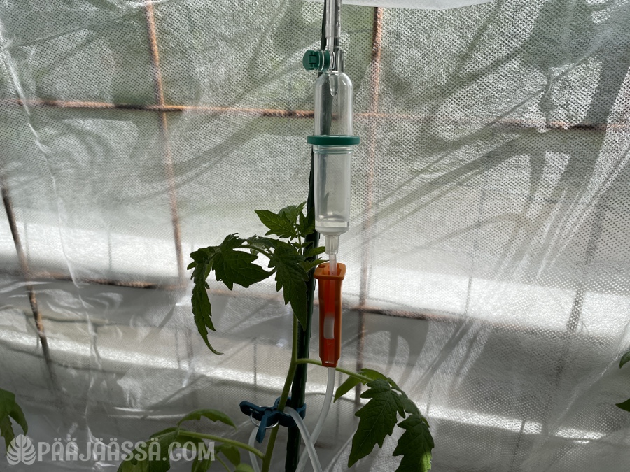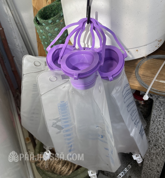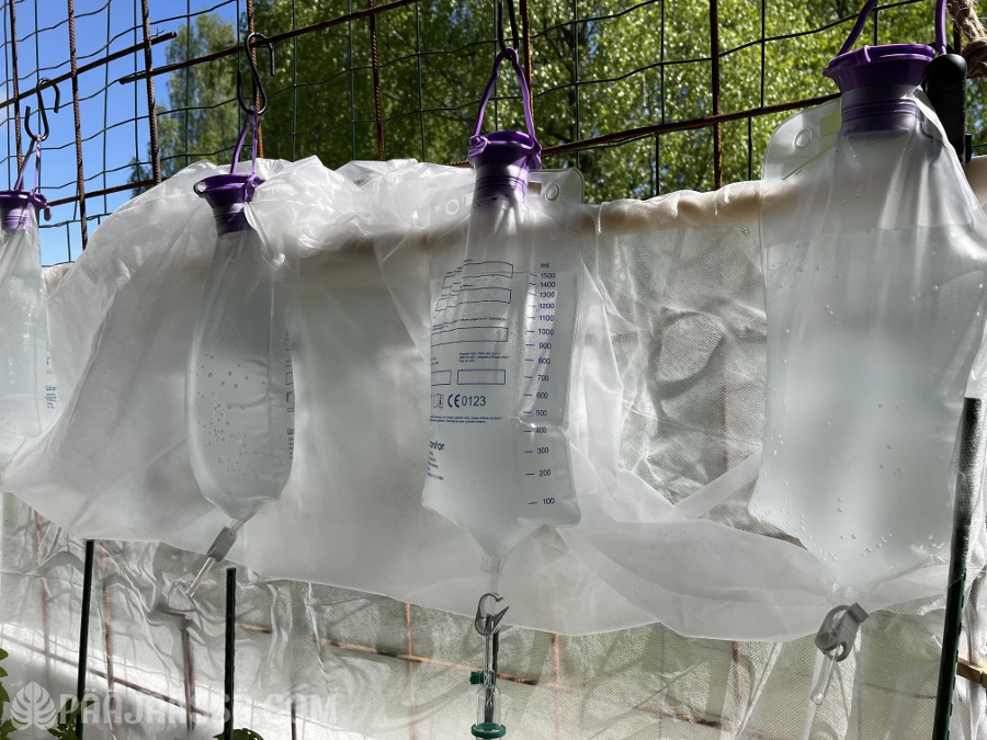 Noh, ne ovat osa kastelujärjestelmää. Sain tuttavaltani ”tippapulloja” joita ei voinut enää tarkoituksessaan käyttää. Kuhunkin pulloon menee 1,5 litraa vettä.
