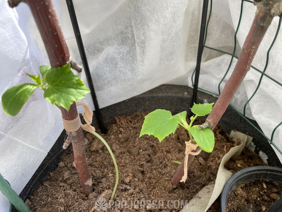 Paprikat ja kesäkurpitsa eivät näytä kasvavan oikein mihinkään. Pitää ilmeisesti virittää myös niille harsot.