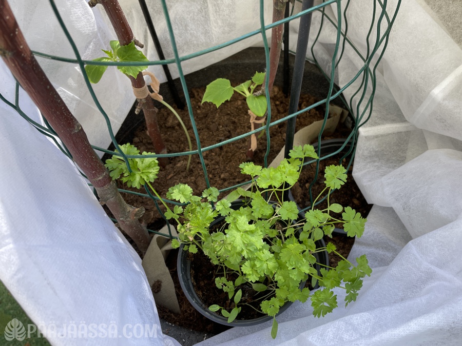 Olen istuttanut parvekkeelle miltei kaiken, mitä aion laittaa sinne. Edellinen parvekekatsaus on kirjoitettu 27.5. ja sen jälkeen olen istuttanut muun muassa avomaankurkut paikoilleen. Yöt ovat olleet melkoisen kylmiä ja sen takia olen suojannut kasvit harsoilla. Tämä kurkkujen harso on siitä kätevä, että se on sellainen ”sukka” mikä pujoitetaan ruukun ympärille. Ei tarvitse sitten tilketä kylmältä ilmalta muita aukkoja kuin päältä. Samalla se suojelee helposti katkeavaa kurkun vartta tuulelta.