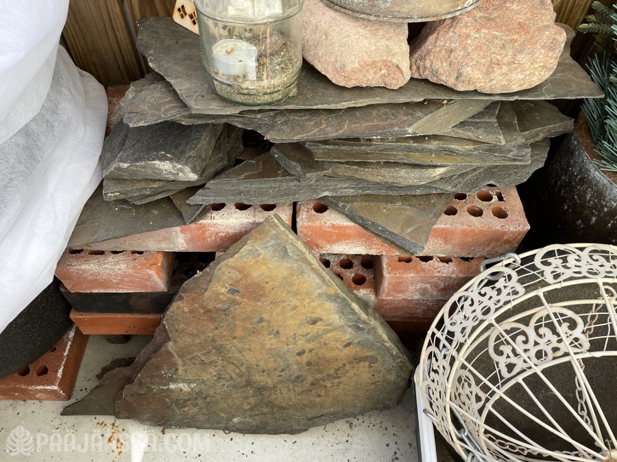 Vesiaiheeseen on tulossa liuskekiviä jonkunmoinen pinkka. Hankin viime viikolla rakentelua varten silikoonia, millä voi liitellä kiviä toisiinsa ja samalla ohjailla veden valumaan tietystä paikasta. Teen vesiaiheesta ihan oman blogikirjoituksen sitten, kun siitä on varmasti niin paljon kerrottavaa.