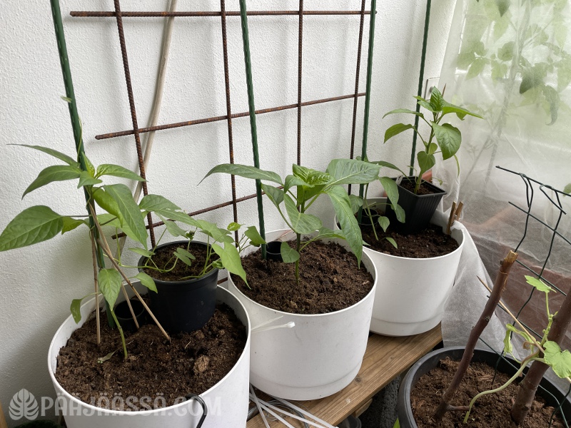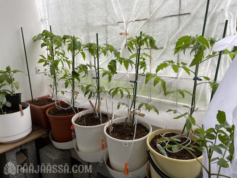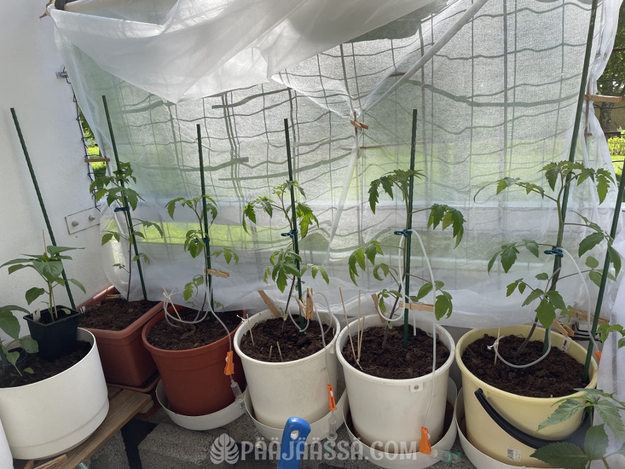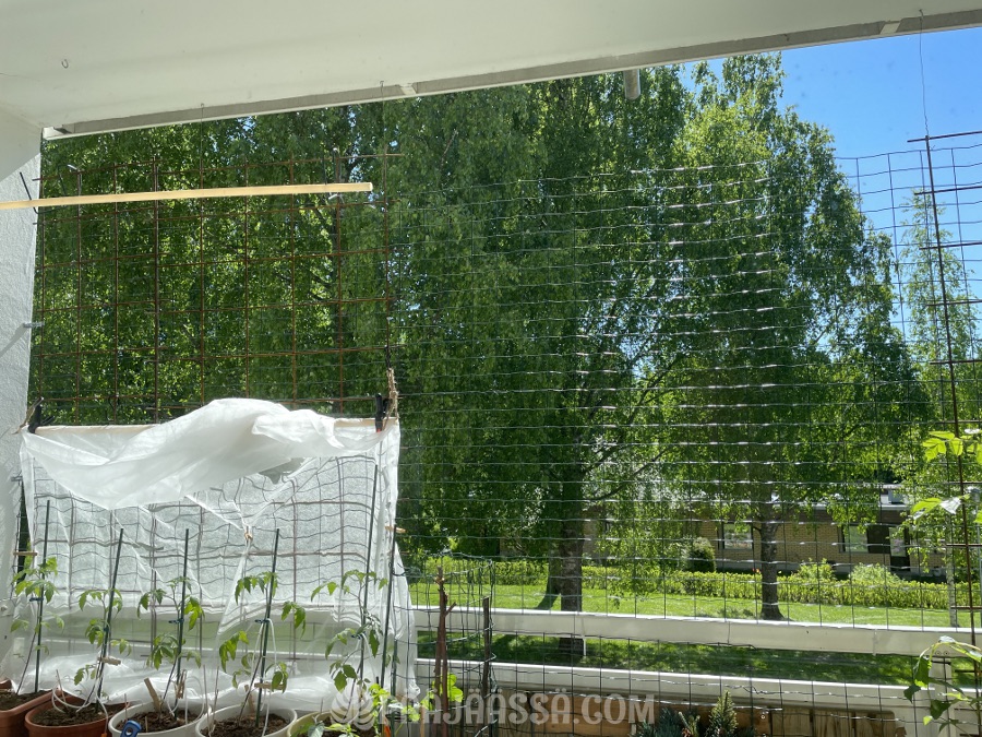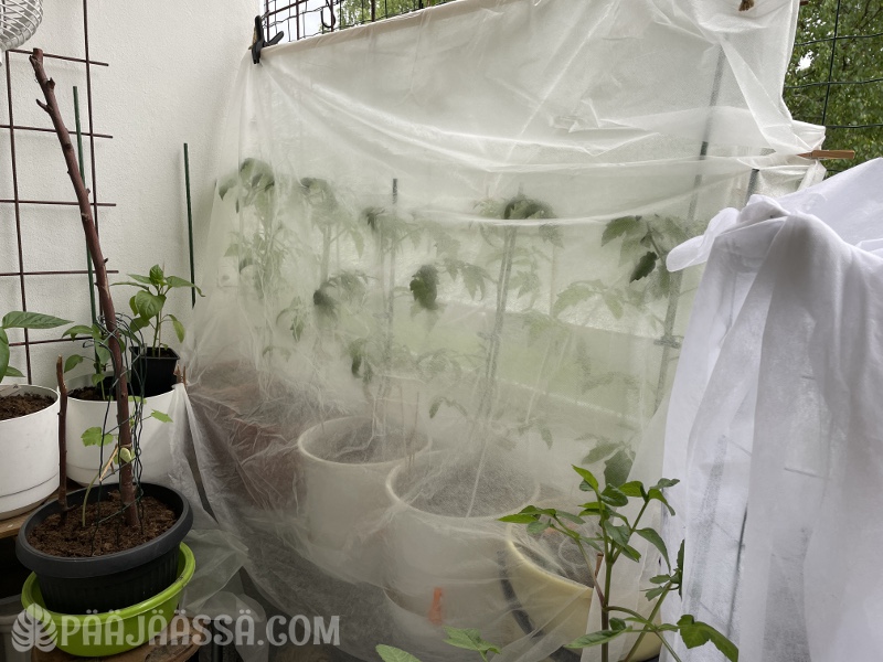 Kaikki tomaatit ja paprikat on myös istutettu parvekkeelle. Tomaateille on viritetty kateharso. Olen pitänyt verhoa alhaalla muutamana yönä, ja varsinkin jos on ollut tuulista ja sateista. En myöskään halua, että pienet taimet kärventyvät auringossa. Harso suojelee niitä myös auringon paahteelta. Kun taimet ovat suurempia, harson voi ottaa alas. En missään tapauksessa poista sitä. Onpahan valmiina sitten syksyllä jos ja kun sitä tarvitsee.