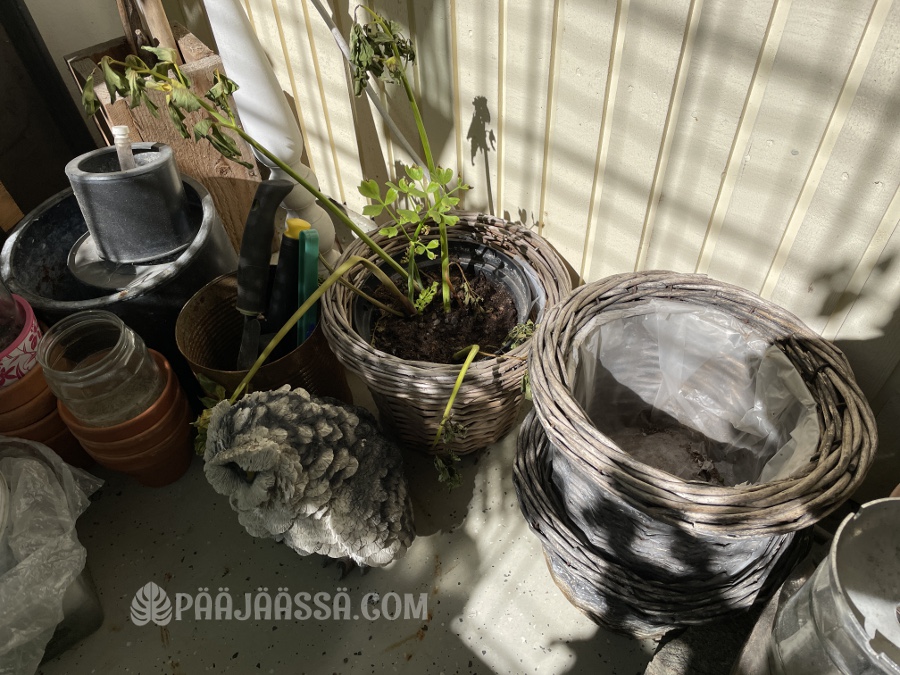 Parvekenurkkaus on vielä ihan sekaisin. Kävin pari viikkoa sitten hakemassa tuttavaltani lipstikkaa, ja laitoin sitä ruukkuun kasvamaan. En tiedä viihtyykö, mutta kokeillaan. Siirsin lipstikan tänään vähän aurinkoisempaan paikkaan, jos se vaikka viihtyisi tässä nurkkauksessa paremmin. Se on hieman nuupahtanut, mutta uusia kasvun merkkejäkin löytyy.