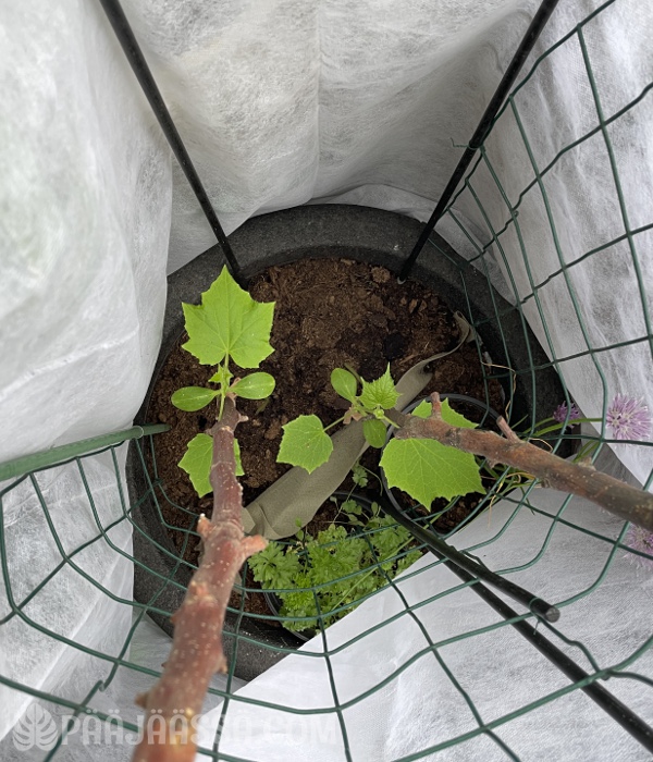 Avomaankurkut on suojattuna parvekepuutarhassa.Avomaankurkut on istutettu suureen termoruukkuun jossa kasvoi aikaisemmin angervo.