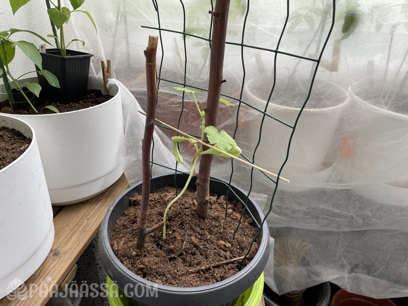 Avomaankurkku alkaa myös olla sen kokoinen, että se ei oikein tahdo kestää kehikon sisällä. Aikomuksena on tehdä sille lisätukia, missä se saa kasvaa niin pitkälle kuin haluaa. Kuvassa oleva keppi liittyy asiaan. Pitää miettiä tarkemmin mitenkä tukinaruja aikoo tuonne ripustaa. Yhdessä tomaattienkasvatusohjeessakin oli, että tomaateista ei kannata poistaa lehtiä, ettei niihin pääse tauteja siitä ”haavakohdasta”. Olkoot lehdet siis paikoillaan. Samasta syystä tomaattia ei kannata latvoa.