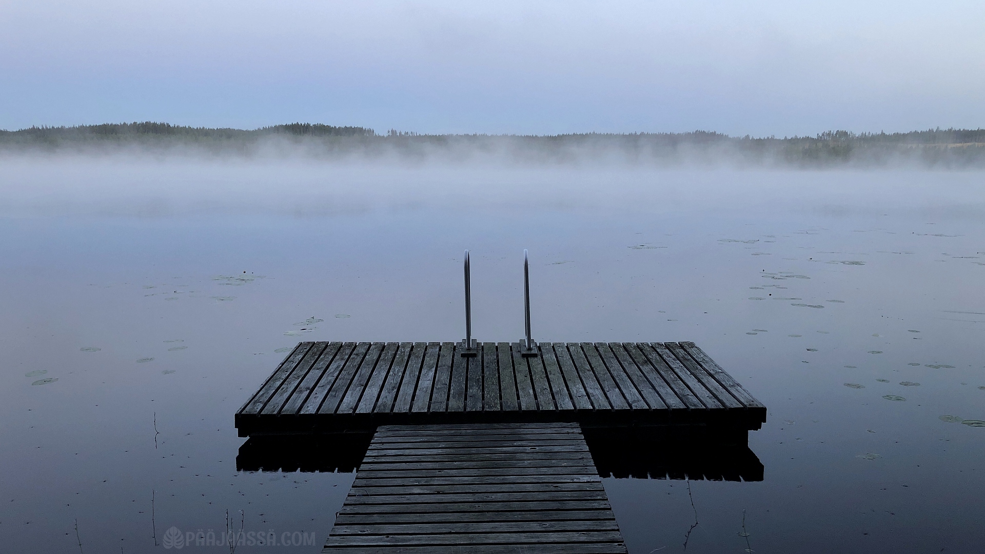 Viimeistä näkymää jäinkin sitten ihailemaan toviksi, vaikka kello olikin aamuyöllä 3:35! Piti heittää visiitti hotelli helpotukseen, ja takasin tullessa oli vain pakko pysähtyä äimistelemään tätä näkyä. Näky oli kerta kaikkiaan ällistyttävä. Sumu liikkui veden päällä aavemaisesti. Veden pintaa ei erottanut kauempana. Tästä olisi vielä puuttunut se, kun joku olisi soutanut tuolta sumun seasta rantaan. Näkymä oli suorastaan kuin unesta! Jos haluat tämän kuvan ladata itsellesi tietokoneen taustakuvaksi, voit tehdä sen TÄSTÄ Kuva avautuu uuteen ikkunaan josta voit ladata sen koossa 1920x1080px. Kuva on otettu 17.7.2021