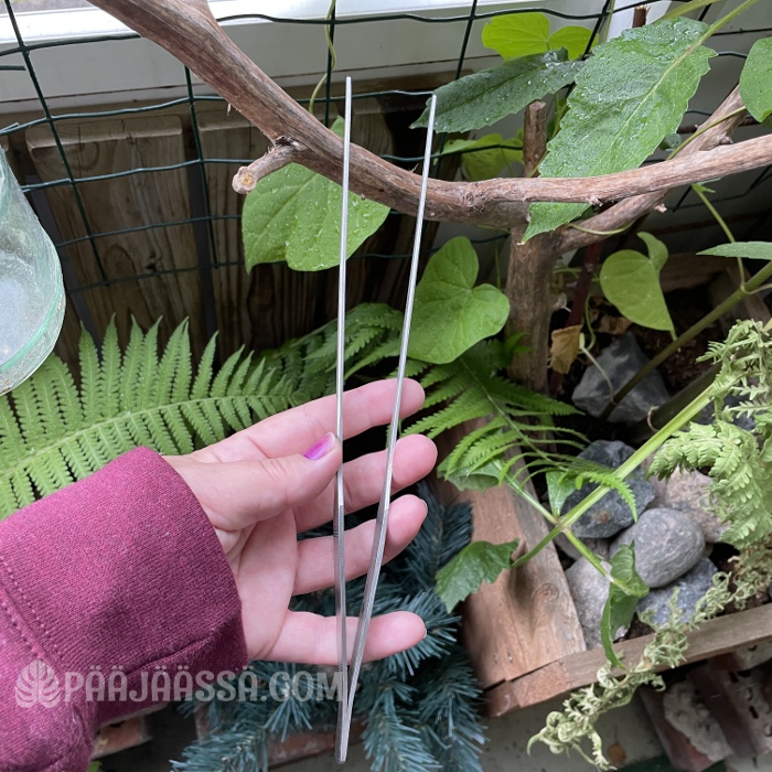 Olen säästänyt akvaarioharrastuksestani joitain välineitä, joista uskoin olevan hyötyä. Niin myös näistä pinseteistä. Näillä voi noukkia suuremmatkin toukat ja ötökät ilman kirkumista ja pudottaa ne vain nätisti parvekkeen laidan yli paremmille viheriöille.