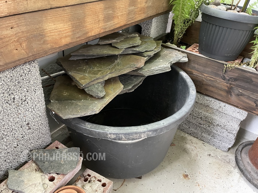 Kun lämmintä on +28C, ei oikein jaksa parvekkeella puuhastella mitään. Siellä on niin kuuma, että projektit on jäässä, jos asiaa voi tällä tavalla ilmaista. Kävin eilen siistimässä parveketta, ja lajittelin mullat astioihin ja pinosin paljun vesiaiheen liuskekivet paljun päälle. Sitten vain pumpun letku tuonne väliin ja vettä täyteen. En aio tehdä tästä mitään spektaakkelimaista viritelmää, vaan yksinkertaisen ja rauhallisen näköisen vesiaiheen.