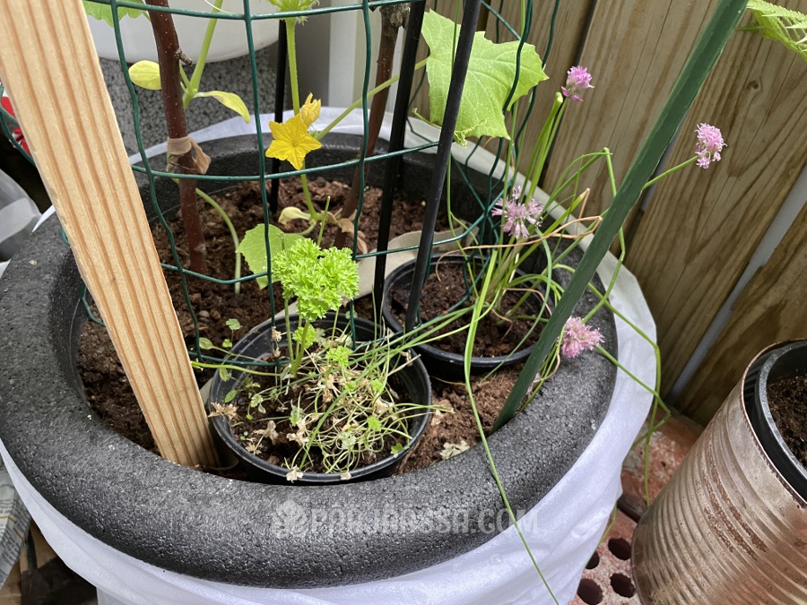 Hyvin niukasti kasvaa myös avomaankurkku. Nyt on kyllä niin kylmät kelit, että on suoranainen ihme jos saan näistä mistään satoa. Toki yrtit kasvavat. Kurkkujen kanssa on persilija ja ruohosipuli. Kunhan saan siivottua kaiteen vierustan, niin laitan kurkkujen viereen myös tuttavalta saadun tillin. En ole onnistunut kasvattamaan tilliä aiemmin parvekkeella, vaikka joku joskus väittikin, että se olisi helppo. Täytyy muistaa vaan leikellä yrttejä enemmän.