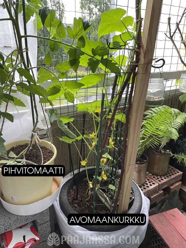 Kurkkujen telinettä täytyy vielä jotenkin tuunata. Kävin katsomassa pihalta, miltä parveke näyttää muiden silmissä. Kurkkujen puinen tukipylväs näytti aivan joltain hautaristiltä! Että, kyllä sille on jotain tehtävä! Todennäköisesti otan siitä alas poikkipalkin, missä tällä hetkellä roikkuu pari lyhtyä. Ne eivät nyt ehkä ole ihan niin välttämättömiä.