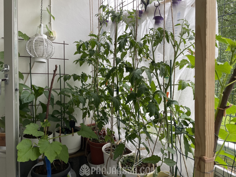 Parveke näyttää sellaiselta tällä hetkellä kuin siellä kasvaisi jotain! Pitää taas kohta tehdä virityksiä, että esimerkiksi tomaatit mahtuvat kasvamaan. Yksi Money Maker-tomaatti on kasvanut erityisen paljon.
