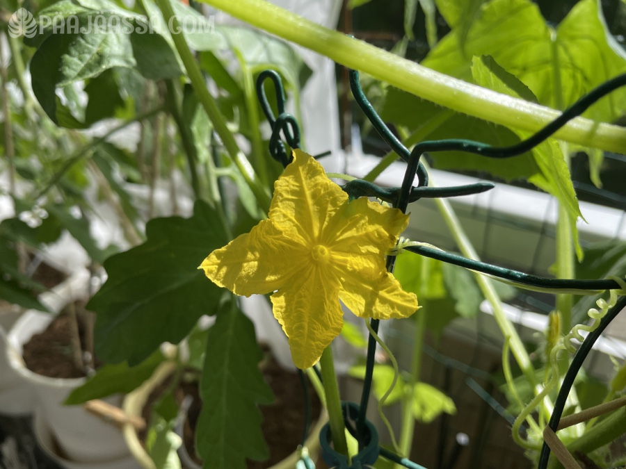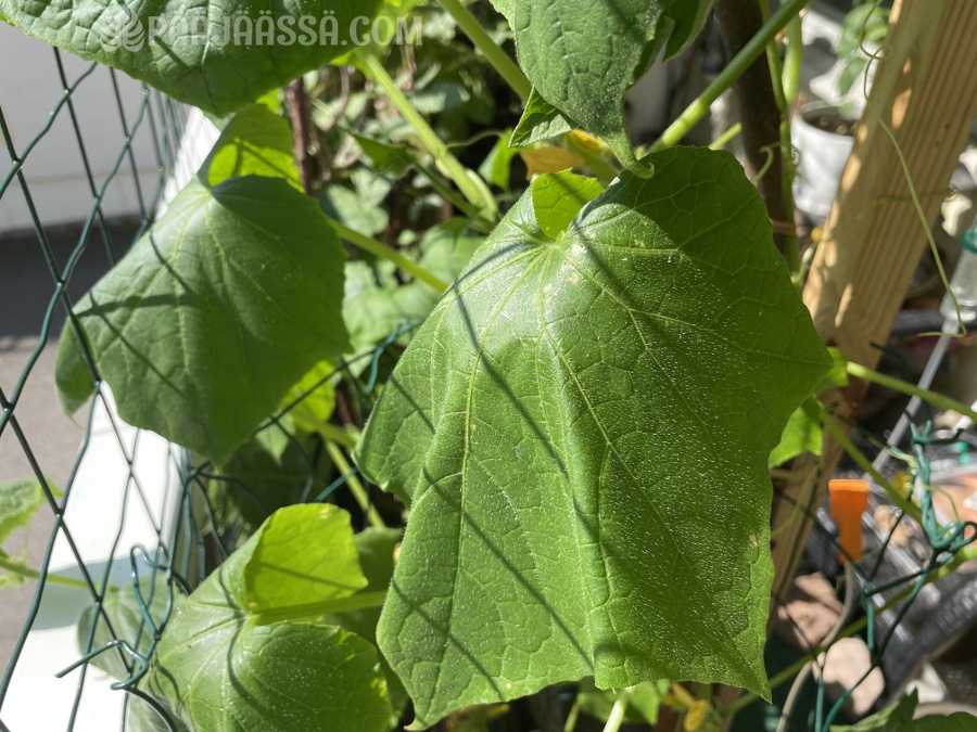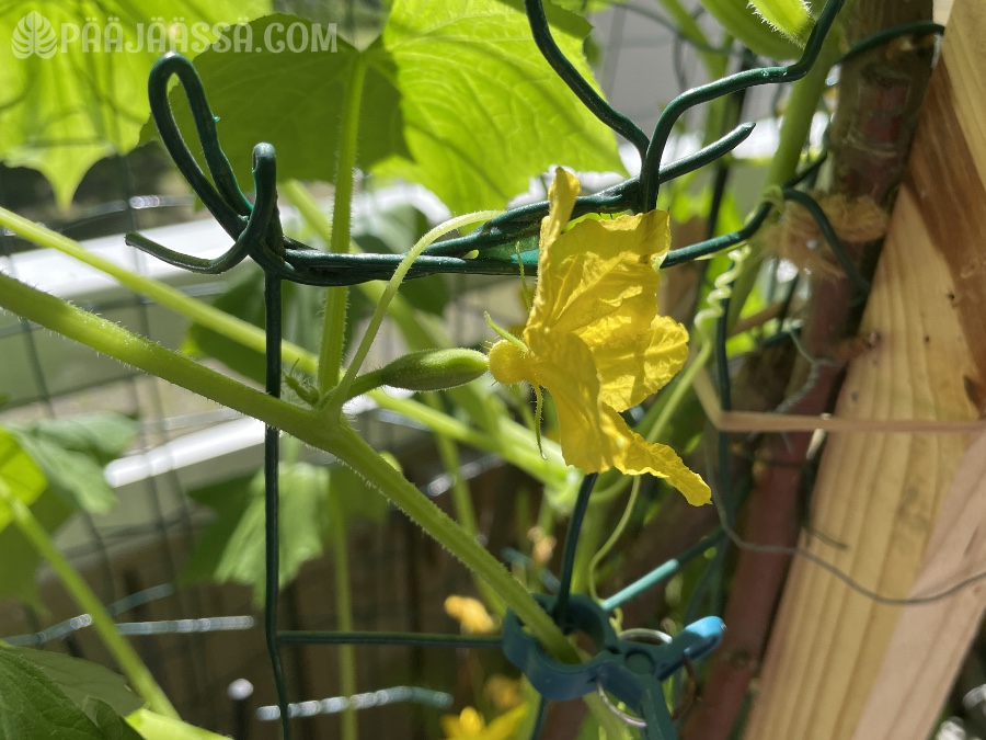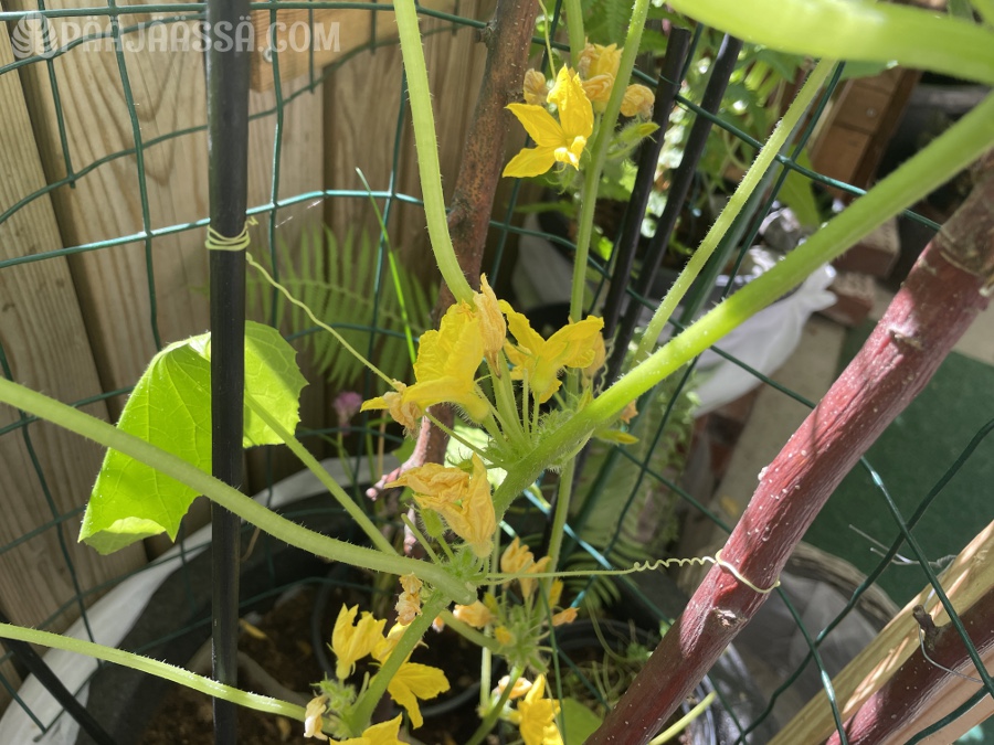 Avomaankurkku on täynnä kukkia. Tänä vuonna parveke vaikuttaisi olevat oikein hyvä kasvupaikka niille. Nämä taitavat tosin olla hedekukkia? Niihin ei kasva kurkkua. Pitää ottaa selvää miksi niitä tulee niin paljon. Vaikuttaako siihen kasvualusta, kastelu, lämpötila vai mikä. Paljon löytyy ohjeistusta, mutta missään ei ole täsmällistä ohjetta mihinkään. ”Kurkku tarvitsee paljon vettä”… mitä on ”paljon”? Onko se kolme litraa päivässä, vai litran päivässä? Osa kurkuista on myös itsepölyttyviä. Miksi siemenpussissa ei lue tätä tietoa?