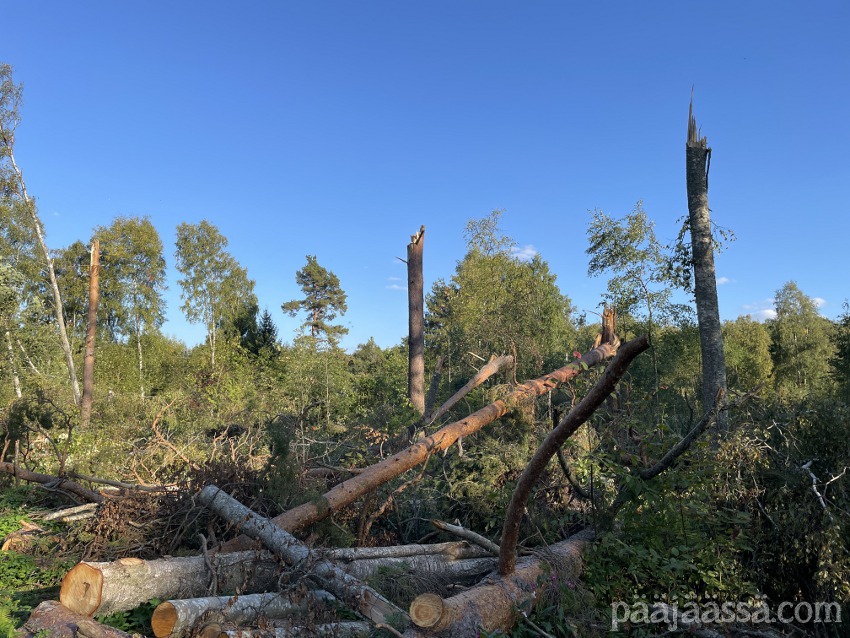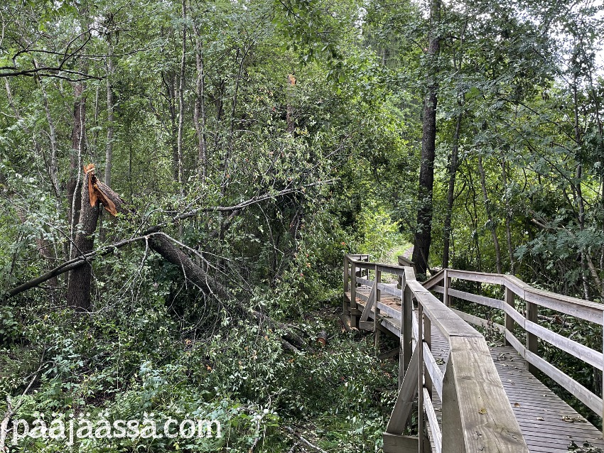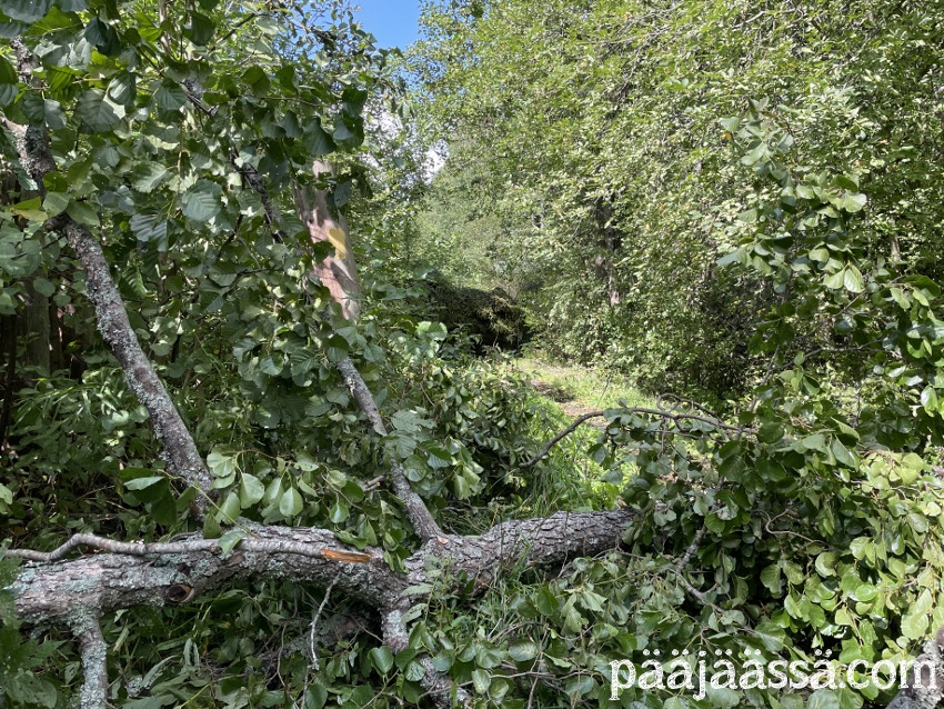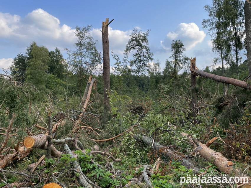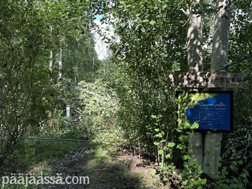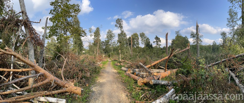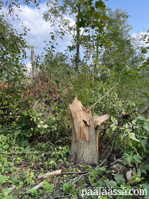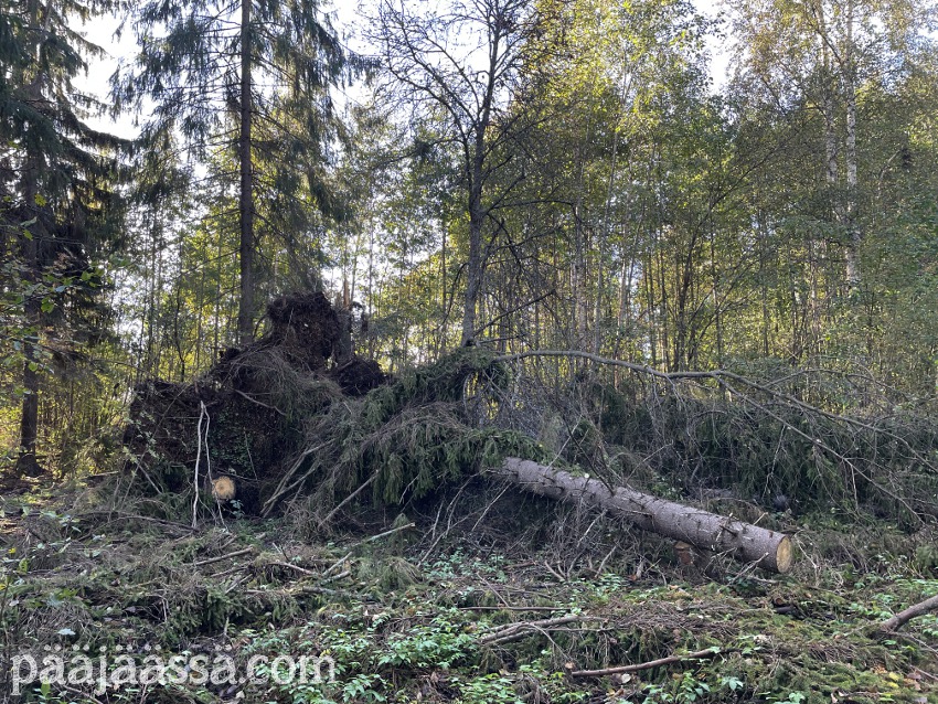 Kruisailin lintutornilta Seppoinpolkua pitkin Lietteen uimarantaa kohti. Ensimmäisenä kohtasin suuren kuusen juurakon, joka oli muistutuksena trombista mikä oli sen kaatanut. Juurakko oli todella suuri. Jos olisin seisonut sen vieressä, se olisi minua paljon korkeampi. Aikamoinen voima tuollaisella trombilla on. Mutta jatkoin matkaa…