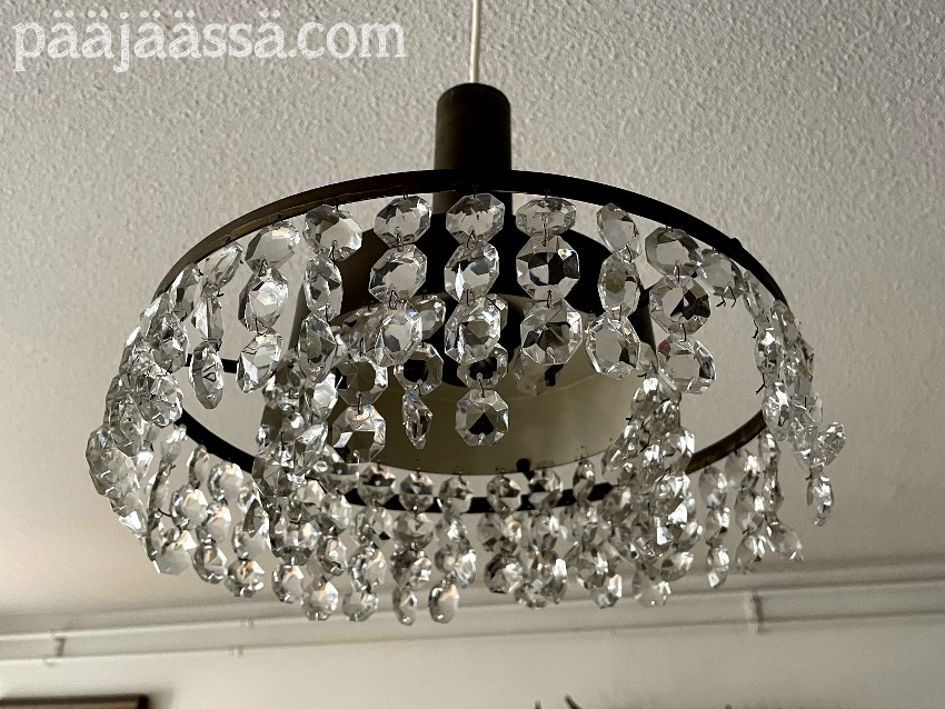 Sain tuttavalta tällaisenkin kattovalaisimen, jossa on kauniita kiventuntuisia helmiä, vai miksiköhän noita nyt kutsuttaisiin. Kristallia ne eivät ole, vaan kyllä ne ovat jotain muovisekoitusta. Osa niistä oli kuitenkin tippunut aikojen saatossa valaisimesta pois, niin päätin irrottaa ne kaikki ja järjestellä uudelleen… vähän omalla twistillä. Mutta lopputuloksen saa nähdä sitten kun olen kasannut sen valmiiksi. Tämä valaisin on menossa huonekasveille nurkkaan. Se olisi aivan liian pieni olohuoneen päävalaisimeksi.