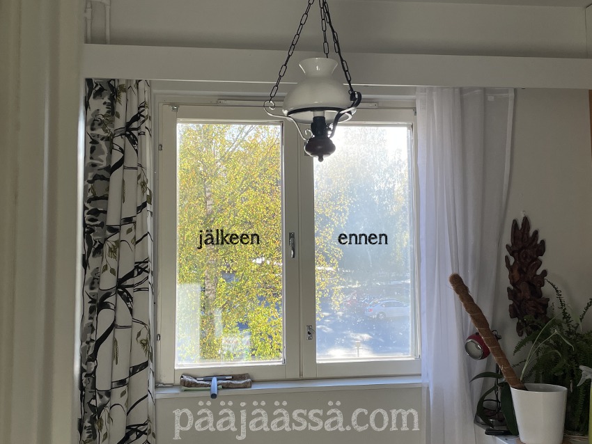 Jostain mielenhäiriöstä sain myös päähäni pestä keittiöstä ruokailutilan ikkunat, mikä osottautuikin erittäin tarpeelliseksi. Päätin myös laittaa tilan tavarat ojennukseen. Se on ollut todo-listalla varmaan keväästä asti. Käytin ruokailupöytää taimien kanssa hääräilyyn, niin siinä oli koko ajan jotain multasäkkejä tai -astioita. Minulle on loppukuusta tulossa taas ihanat kissat hoitoon, niin haluan, että he pääsevät katselemaan tuosta ikkunasta ulos.