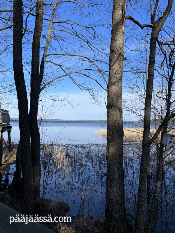 Onneksi erään puun takana oli sellainen paikka, johon pääsin auringolta suht suojaan. Virittelin itselleni rantapyyhkeen maahan ja kaivoin esiin kiikarit, jos minulle tulisi odotellessa vaikka tylsää, ja jossain näkyisi vesilintuja. Oli minulla sateenvarjokin mukana, jota aluksi käytin aurinkovarjona. Jossain vaiheessa tuuli kääntyi sellaiseen suuntaan, että se nappasi varjon mukaansa. Aurinko oli jo kääntynyt puun taakse, eikä sen säteet enää osuneet minuun oksien välistä. Laitoin varjon kasaan.