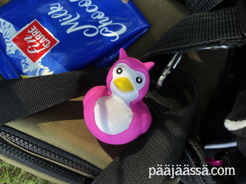 Sää todellakin helli meitä tänä vuonna. Lämmintäkin oli +27°C eikä tuullut mitenkään erityisesti. Rastin tehtävänä oli rakentaa/loihtia kylpyankalle lautta, jonka päällä se pysyy 60 sekuntia. Oli siis hyvä juttu, ettei tuuli ollut navakkaa. Mistähän lie ankan olisikaan joutunut muuten hakemaan. Kilpailijoilla oli omat ankat mukana. Minulla oli vain testailuja varten oma ankka.