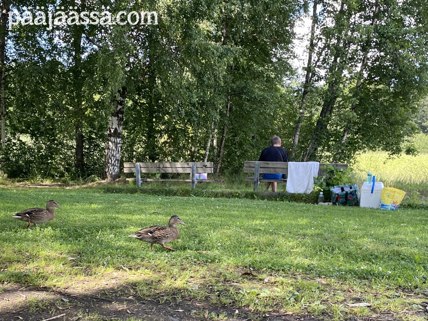 Onneksi lähellä ollut penkki oli toisinaan vapaana, ja sain leppuutella jalkojani myös siinä. Terijoensalavien katveessa oli oikein mukavaa olla. Alueella tepasteli myös todella kesynoloisia sorsia. Ne kävivät tarkistamassa olisiko ihmisten kasseissa mitään syötävää. Eräs lapsi tokaisi, kun sorsat menivät lähelle, että saako hän viedä sellaisen kotiin lemmikiksi. Vanhempansa vaan totesivat hieman naurahtaen, että ei se oikein käy kun heillä oli jo entuudestaan jotain lemmikkejä.