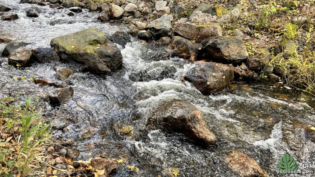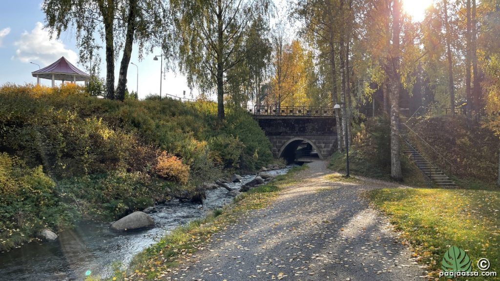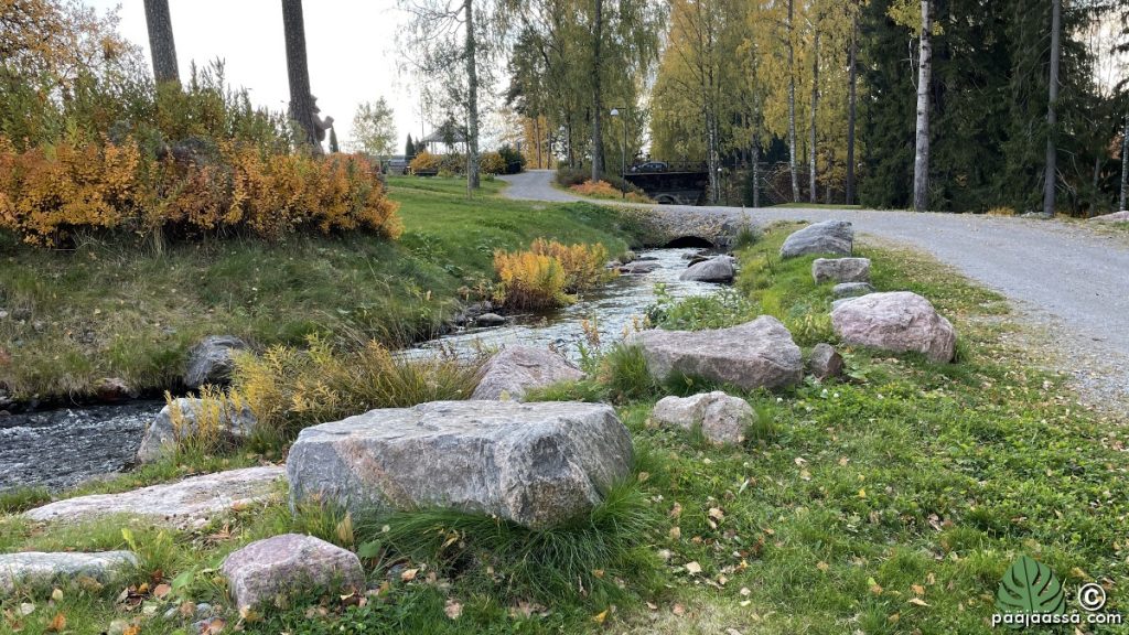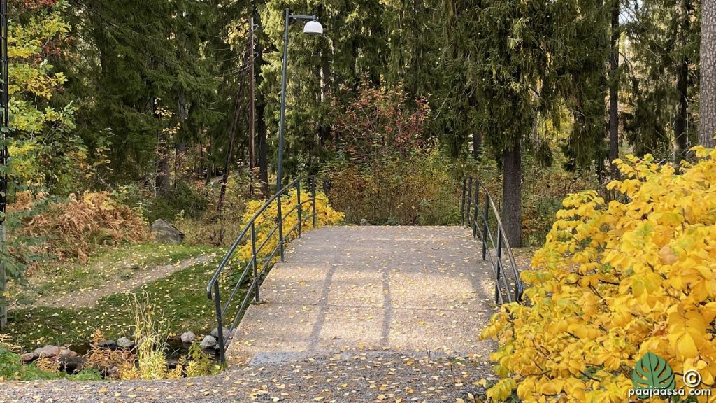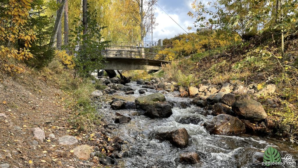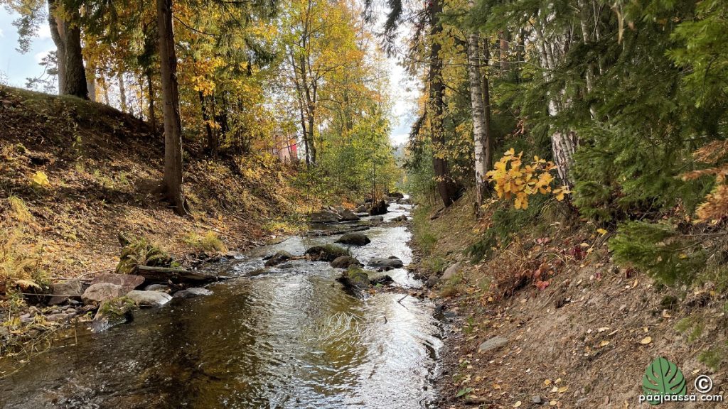 Tämä syksyn väriloisto on kyllä tänä vuonna erityisen upea täällä Imatralla. Puron ympärillä on paljon kasvustoa, ja kaikki värit oikein korostuu jos sattuu olemaan aurinkoinen päivä, niin kuin meillä oli 2.10.2021 iltapäivästä alkaen. Oli ihan parasta olla ottamassa kuvia tästä nähtävyydestä noin kello 16, jolloin valo ei ollut enää ihan niin ”rajua” kuin päivällä. Aikani ihasteltua puron kauneutta ja solinaa, lähdin kulkemaan puron alkulähdettä kohti… siispä siirryin sillan toiselle puolelle.