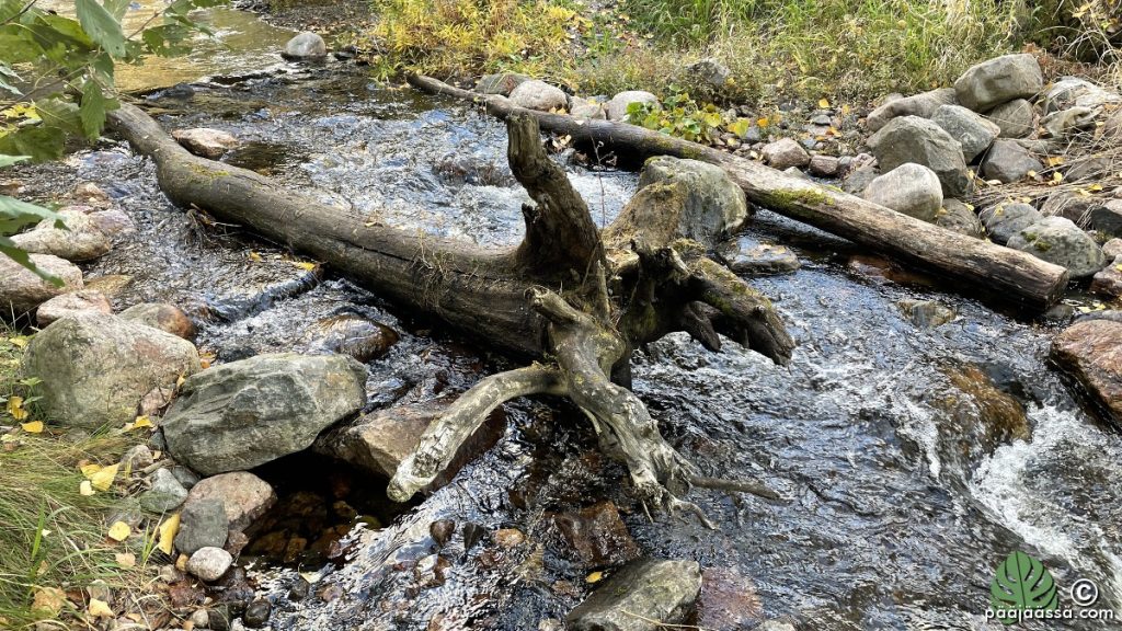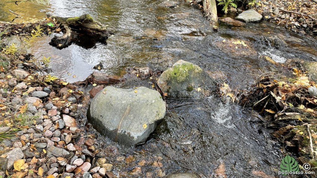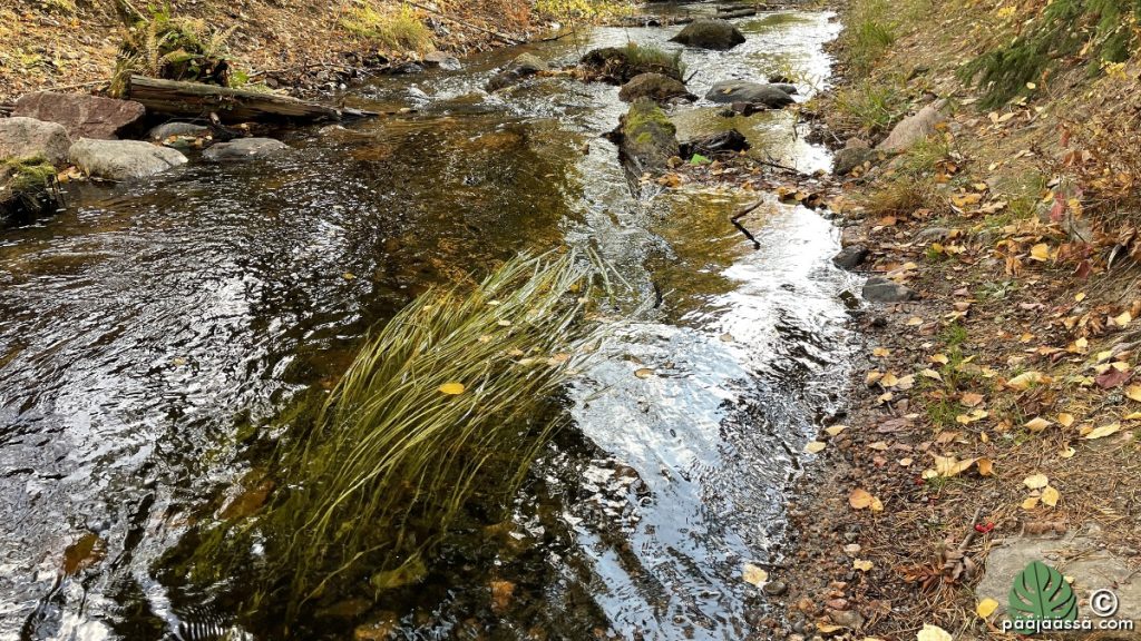 Purossa kulkeva vesi oli todella kirkasta! Oikein silmiä hiveli. Sen voi kuvitella johtuvan ainakin osin puroon asetelluista ”koristeista”.