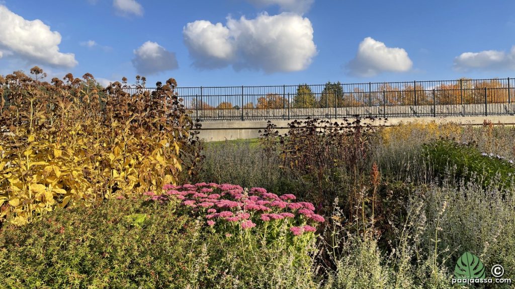 Kulkuväylän toisella puolen oli suurehkoja kukkapenkkejä, joista osa vielä kukki ihan täysiään! Olin aika yllättynyt, kun vielä joitain kimalaisia yritti käydä komeamaksaruoholla syömässä. En tiennyt, että kimalaisia enää on missään. Nyt on kuitenkin jo lokakuu.