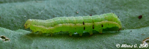 Tässä on sitten sellainen elukka, joka todennäköisimmin pisti yhden liljan poskeensa, ja teki myös hallaa daalialle. Kyseessä on gammayökkönen (correct me if I’m wrong). Toukka oli noin 25mm mittainen.