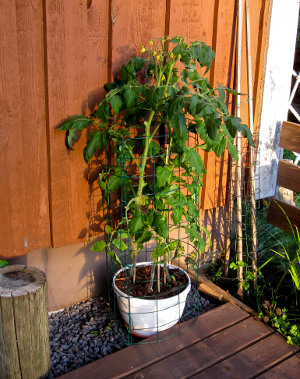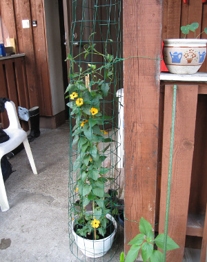 Kiikutin parvekkeelta muutamia rehuja kaverin pihalle. Vasemmassa kuvassa on mustasilmäsusanna, joka meinasi pakahtua parvekkeelleni. Laitoin sen ympärille tuollaisen kehikon, jotta se kasvaisi siihen kiinni ja tekisi sellaisen korkean kasvipatsaan. Oikeanpuoleisessa kuvassa on, uskokaa tai älkää, parveketomaatti. Kysympähän vaan, että minkä kokoiselle parvekkeelle tämä on oikein tarkoitettu? Mainoksen mukaan sen olisi pitänyt kasvaa noin 30cm korkuiseksi, mutta kyllä tämä on lämemmäs 60cm korkea 😀