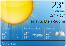 MuutHuhhuh, nyt sentään tässä koneen ääressä voi jotakin tehdä! Viimeisten reilun kahden viikon aikana tässä on ollut melkoisen kuumat oltavat. Suomen yli sattui pyyhkäisemään melkoinen helleaalto, joka kesti kolmisen viikkoa. Imatrallakin oli lämmintä melkein joka päivä 28-32°C ja tässä koneen äärellä se tarkoitti jotakin neljääkymmentä. Parvekkeella oli mittarin mukaan (varjossa) °45C. Ei paljoa naurattanu! Nyt on ensimmäinen viileä päivä, vain 22 astetta 😀