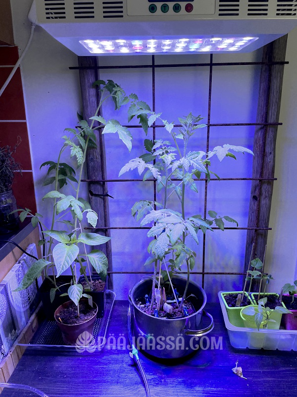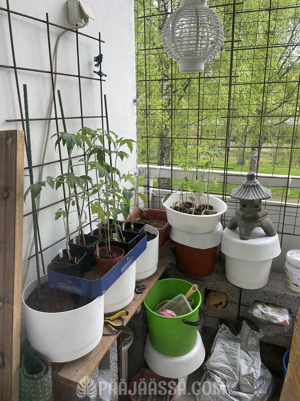 Kaikki tomaatit ja paprikat on myös istutettu parvekkeelle. Tomaateille on viritetty kateharso. Olen pitänyt verhoa alhaalla muutamana yönä, ja varsinkin jos on ollut tuulista ja sateista. En myöskään halua, että pienet taimet kärventyvät auringossa. Harso suojelee niitä myös auringon paahteelta. Kun taimet ovat suurempia, harson voi ottaa alas. En missään tapauksessa poista sitä. Onpahan valmiina sitten syksyllä jos ja kun sitä tarvitsee.