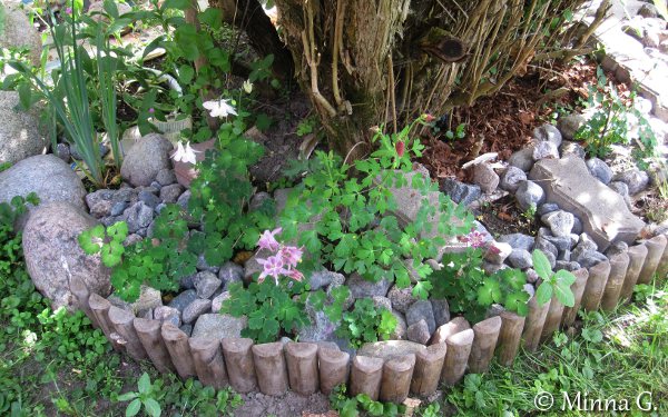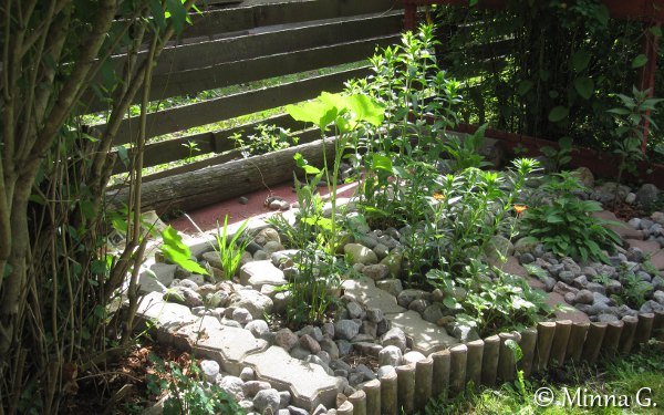 Lupasin myös väriminttua tuttavalleni. Se lähti ihan hyvin kasvamaan keväällä, mutta on sittemmin jäänyt muiden jalkoihin. Pitää etsiä se vielä tuolta rikkaruohojen seasta, jos saisin pelastettua sen. Siirrän sen sitten toiseen kohtaan, jossa se voisi viihtyä paremmin. Samoin on käynyt hopeatäpläpeipille. Mitähän muuta tuonne rikkakasvien uumeniin on oikein kadonnut?