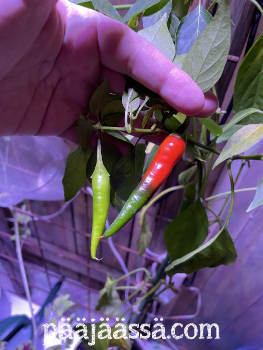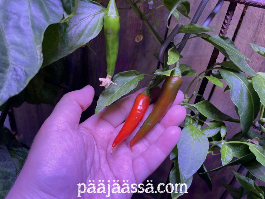 Sato jäi näiden suhteen koko kesääkin ajatellen todella vaatimattomaksi. Muutama paprika ja loppumetreillä muutamat chilit. En tiedä oliko näistä nyt loppu peleissä mitään sen suurempaa iloa tai hyötyä. Oma arvioni koko hyötyviljelystä tälle vuodelle oli, että kaikki lähinnä epäonnistui. Kesä ei lähtenyt käyntiin ja kaikki jäi kitukasvuisiksi. Kaiken kaikkiaan aika turhauttavaa touhua koko hyötykasvien viljely avoparvekkeella 2025 vuoden osalta.