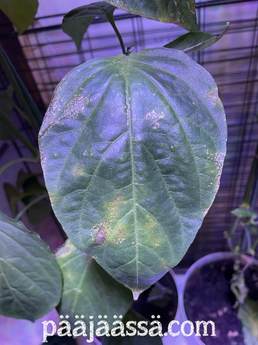 Ja mitäpä muuta niihin olisikaan ilmestynyt kuin ripsiäisiä. Olin myös näkevinäni paprikan lehtihangassa seittiä, eli niihin oli tulossa vielä vihannespunkkejakin. Joka tapauksessa ne ovat nyt roskiksessa. Pitää yrittää saada alue jotenkin siivottua kunnolla, ettei siihen jää ötököitä, jotka sitten leviävät muihin kasveihin. Jätin houkutukseksi värinokkosen vielä alustalle, josko se ottaisi sitten vastaan loput ötökät, jos niitä ilmaantuu. Ei olisi sitten niin suuri menetys, jos tuon joutuu heittämään pois.