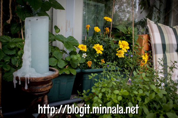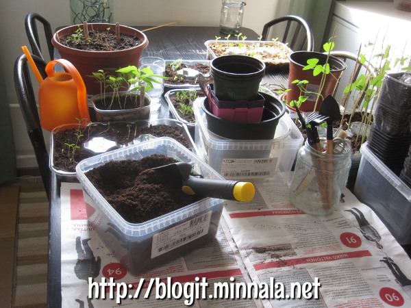 Samettikukat pitää, tai pitäisi, kolmen viikon kuluttua taimien ilmestymisestä koulia. Itse olin hieman myöhässä tämän asian kanssa, joten päätin ryhtyä toimiin. Samoin istuttamani köynnöstävät kasvit, keisarinkierto ja päivänsini, kaipasivat omat ruukut. Chilit olivat tulla istutusastiastaan ulos… eli nekin oli laitettava omiin ruukkuihinsa. Olikin sopivasti harmaa päivä, joten ei haitannut yhtään istua sisällä sormet mullassa!
