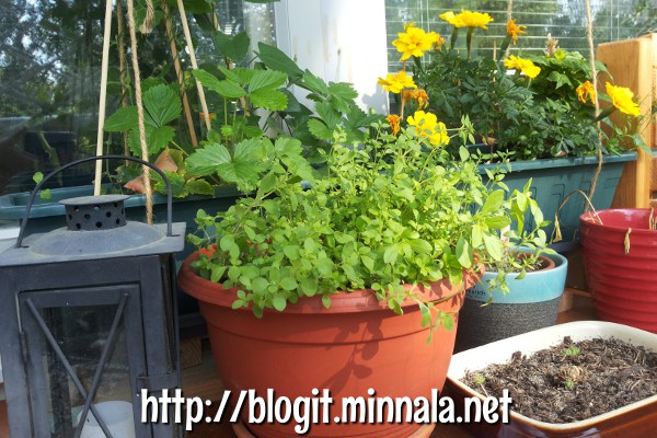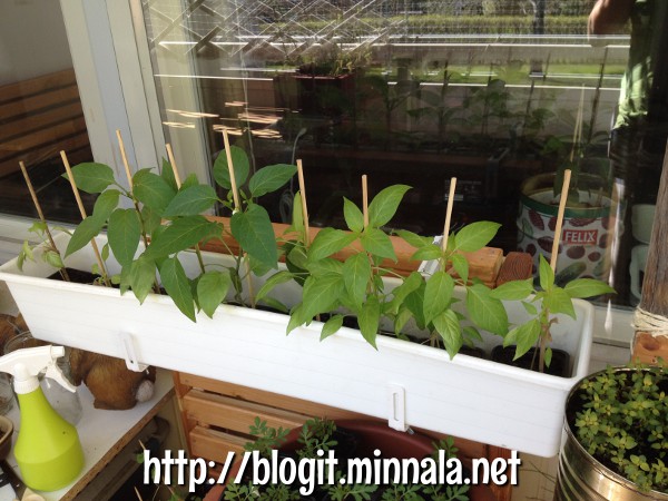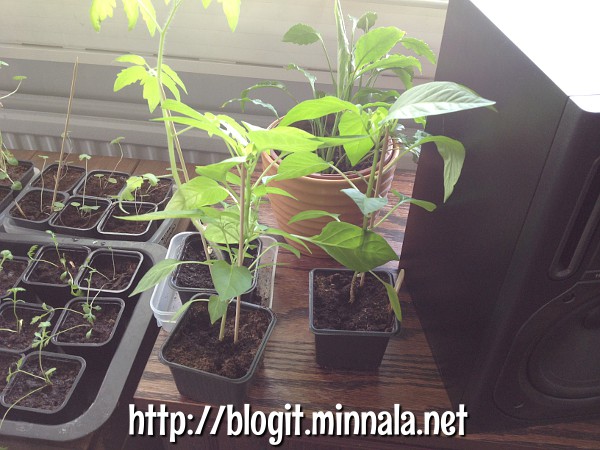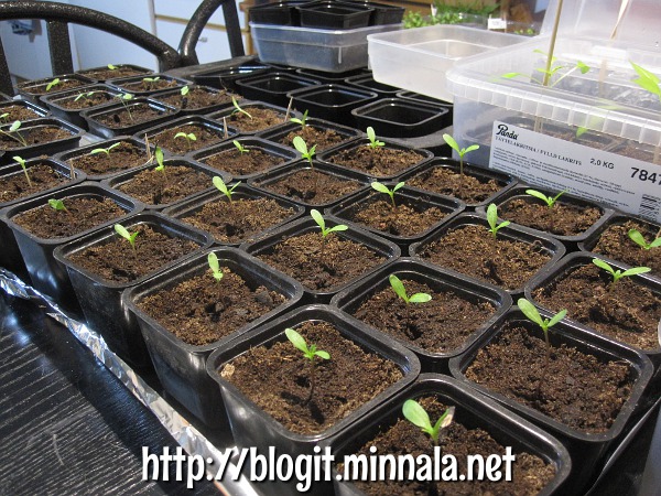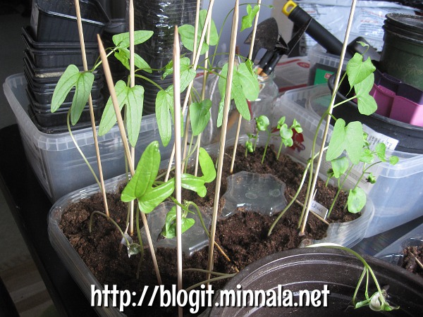 Mikä näihin köynnöstäviin kasvehin tulee, niin pitää yrittää muistaa jatkossa laittaa ne itämään yksittäisiin ruukkuihin. Niitä olisi sitten helpompi siirrellä tilanteen niin vaatiessa. Ja nyt, esimerkiksi mustasilmäsusanna (Thunbergia alata) iti ihan eri tahtiin kun muut. Ne oli siirrettävä hyvin pieninä taimina kasvuruukkuun aikaisemmin, mitä olisi ollut tarve. Toivottavaasti kestävät siirron. Jaa, miksi sitten siirsin ne tässä vaiheessa? Noh, kun idätysastia olisi jäänyt tyhjilleen suurimmalti osin. Käytin päivänsinin ja keisarinkierron taimimullat uudelleen kun istutin taimet uusiin ruukkuihin. Ja vaikka ne olisi jättänyt paikoilleen astiaan, olisi ollut aika turhaa yrittää pitää multaa kosteana (käyttökelpoisena) siihen asti kun susannnat saa astiasta pois. Tajusin myös, etten ollut muistanut hankkia köynnöskasveille tukikeppejä. Eli huomenna on heti lähdettävä kauppaan niitä ostamaan, jotta kasvaminen pääsee kunnolla vauhtiinsa.