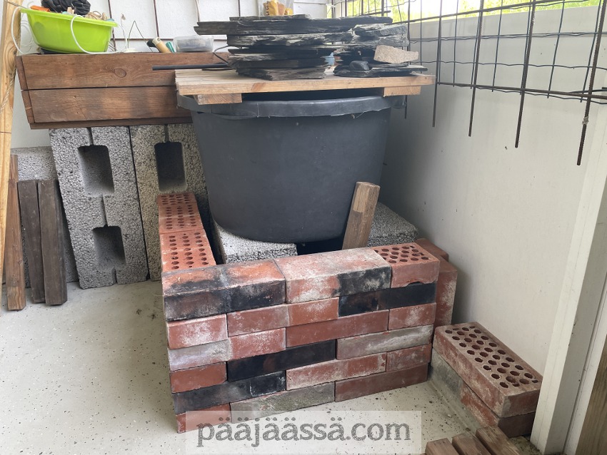 Edellisestä kuvasta ei saanut selvää, mutta kulman takana on piilossa vielä yksi sotku, joka pitäisi siivota pois. Tähän on kertynyt vähän kaikenlaista. Laitan lautaoven eteen sitten tuon pyörillä olevan matalamman puupömpelin (edellinen kuva) ja sen päälle tulee huonekasveja. Miten tuo seinätapetti näyttää nyt jotenkin ihan hirvittävältä? Pitää yrittää malttaa olla repimättä sitä pois eikä aiheuttaa itselle lisää suuria projekteja!