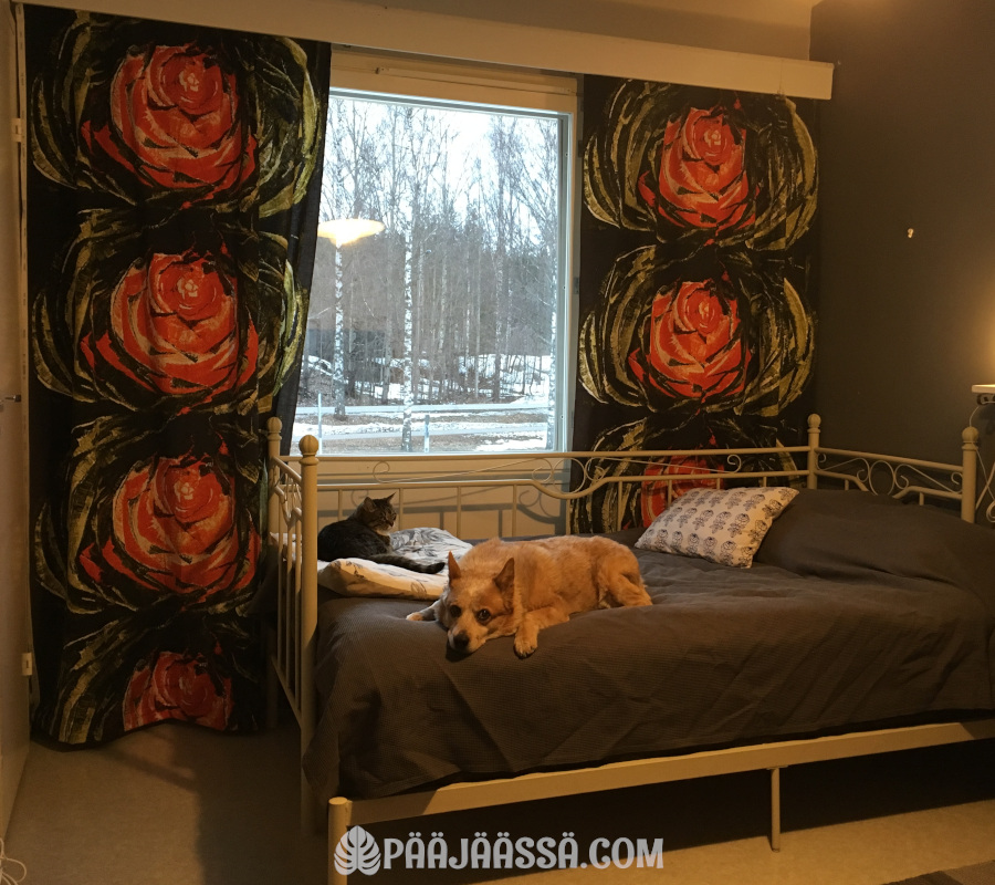 Minulla on yhdet aivan upeat vintage-verhot, joita olen silloin tällöin käyttänyt. Ne ovat vaan suht tummat ja siksi hieman emmin niiden käyttöä juuri nyt, kun on niin pimeä vuodenaika ja mieli ei ole mitä ylimmillään. Ne ovat ihanat design-verhot. Tässä ne ovat makkarissani vuonna 2019, kun Foxy oli vielä elossa. Otin ne pois siinä vaiheessa kun vein Foxyn viimeiselle matkalle.