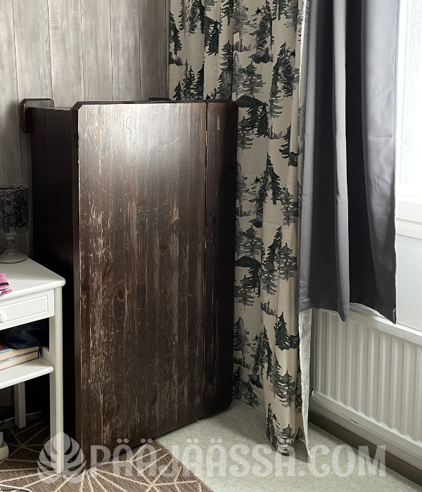 Makuuhuoneessa on yksi murheenkryyni, nimittäin vanha arkkupöytä, jolle en oikein keksi enää mitään paikkaa. Yritin myydä sen, mutta kukaan ei ollut kiinnostunut siitä. Se oli aiemmin sellaisessa kohdassa parvekkeen oven edessä, johon Foxy (koira) kävi tekemässä vahinkopissit, kun ei pystynyt enää pidättelemään. Pöytä ei ollut lattiatasolla, ja se pysyi vahingoittumattomana.