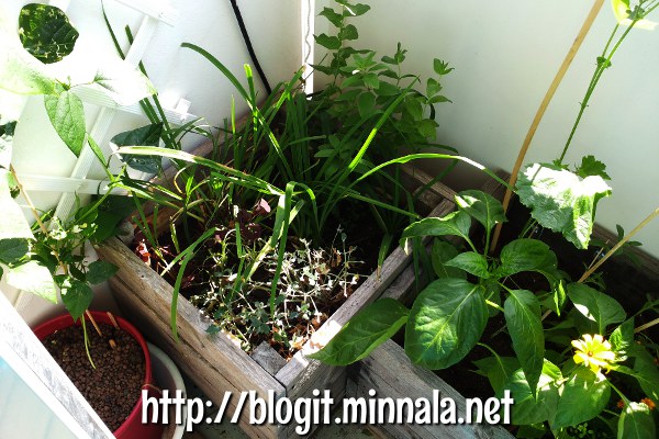 Kaiken kaikkiaan parvekkeella on todella vehreää. Olen siltä osin oikein tyytyväinen tämän vuoden lopputulokseen, kunhan saisin sitä vielä vähän siivottua ja vietyä ylimääräiset roippeet pois.
