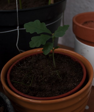 Tämä on siis, uskokaa tai älkää, tammi. Laitoin terhoja ruukkuun 12.2.2009 ja joskus toukokuun puolen välin jälkeen, esiin kurkisti tällainen pikkutaimi. En voinut kuvitellakaan, että tällainen onnistuisi, ja olinkin vähällä kaivaa terhot mullasta ulos, kun huomasin, että yhteen terhoon oli ilmestynyt sellaista ”karvoitusta”. Päättelin tästä, että se saattaisi juuria olla tekemässä. Olin oikeasaa! Tässä tuo taimi nyt komeilee, enkä tiedä mitä hemmettiä sille nyt sitten pitäisi tehdä… bonzai tai jotain. Ei siitä oikein huonekasviksikaan ole, jos se kerran syksyllä pudottaa lehdet pois (aika ruma talvella). Jos jollain on ehdotuksia, niin otetaan vastaan!