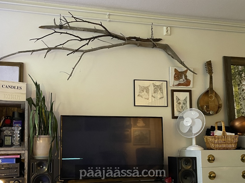 Kultaköynnös pääsi olohuoneeseen sohvan päätyyn kasvivalon alle. Laitoin tukikepin keskelle, ja huomasin jossain vaiheessa, että sen yläosassa on reikä, johon voi ilmeisesti laittaa toisen samanlaisen kepin kiinni. Eli tämä on jatkettava versio. No mutta sehän on kätevää, koska kultaköynnös kiipeää sitten tuota keppiä pitkin ylös, tai ainakin toivottavasti.