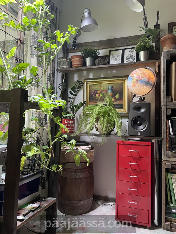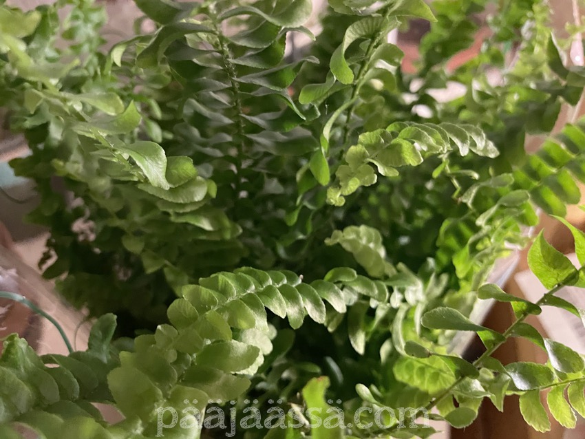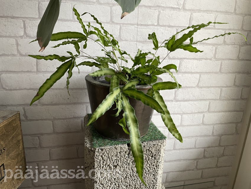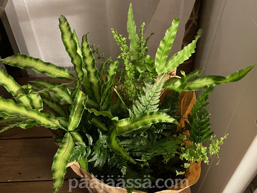 Siivosin keittiön lipastotornin päällisen, kun se oli aivan roskainen. Roskaaja löytyy tuosta kuvasta, ja se on ihmeen kaupalla talvesta selvinnyt sulkasaniainen. Tämä on siis ostoversio, jotka yleensä tapan jossain vaiheessa vuotta.