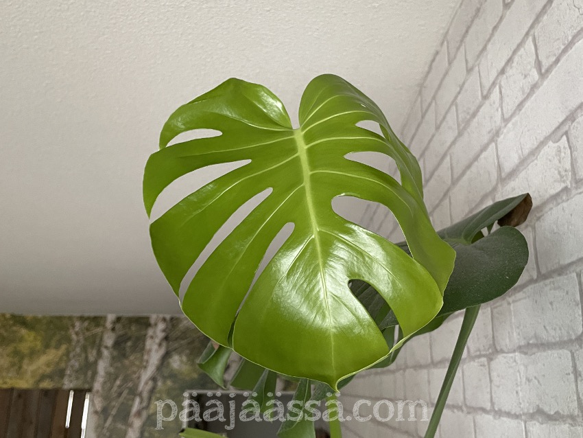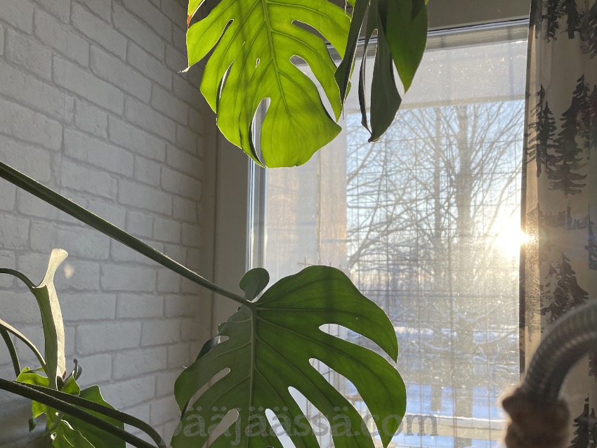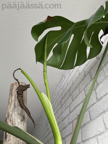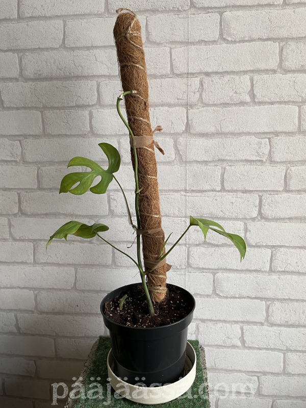 Monta vuotta ruukussa kitunut jättipeikonlehti sai myös uutta multaa, sekä jämäkämmän tukikepin. Tämä on siis siemenestä kasvatettu Monstera Deliciosa, jonka sain joskus eräältä tuttavaltani. Oli tarkoitus aikoinaan laittaa se akvaarioon kasvamaan, mutta ehdin jo luopua akvaariosta, ennen kuin tämä lähti edes kasvuun. Olin aikeissa heittää sen pois, mutta huomasin vielä siinä kasvun merkkejä. Joku ripsiäinenkin sitä ehti jossain välissä järsiä, mutta sain sen hävitettyä kasvista pois. Laitoin uudelleen istuttamisen yhteydessä juurille muutamia rakeita kanankakkaa. Katsotaan miten sen käy.
